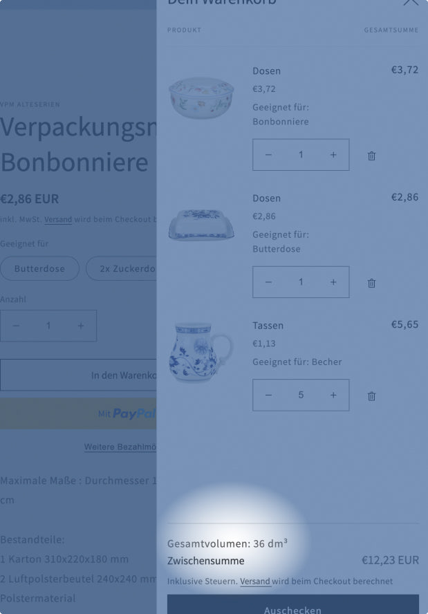Die Versandkosten werden in dm³ berechnet. Hier finden Sie eine Preisübersicht. Im unteren Teil des Warenkorbs können Sie das tatsächliche Volumen der im Warenkorb liegenden Artikel einsehen und im Anschluss feststellen, wie hoch die Versandkosten sind.